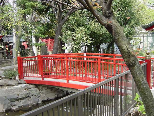 それは、朱色の可愛らしい橋でした。錦鯉も泳いでました。